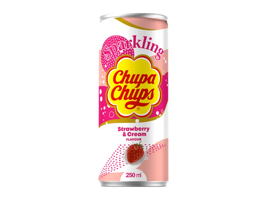 Kohlensäurehaltige Erdbeerlimonade und Sahne. Beliebter Hersteller von Chupa-Chups-Süßigkeiten präsentiert sich Ihnen in einer neuen Dose – in Form einer spritzig-erfrischenden Limonade mit dem einzigartigen Geschmack cremiger Erdbeeren.